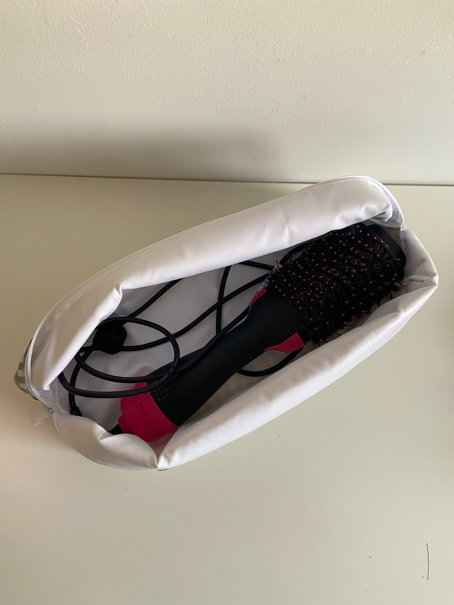 Por su forma alargada y súper espaciosa es ideal para guardar y transportar tus herramientas para el pelo: plancha, tenacillas, herramientas de moldeado como DYSON, BAMBA, o secadores pequeños.
