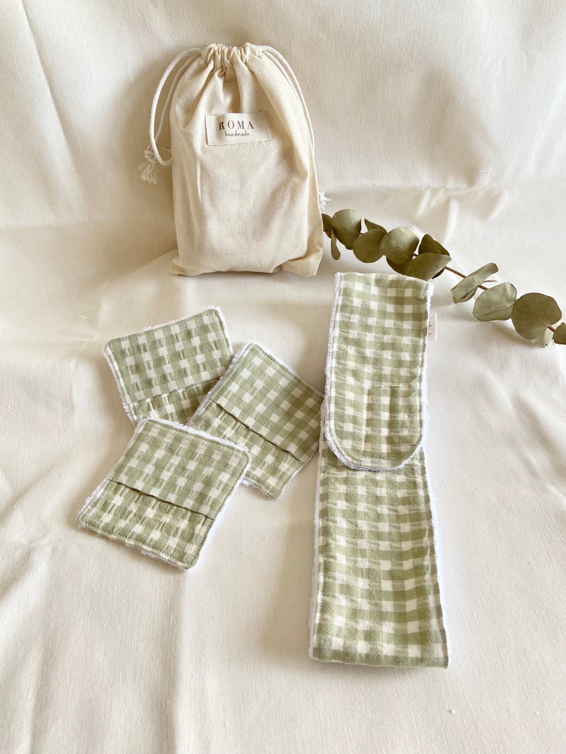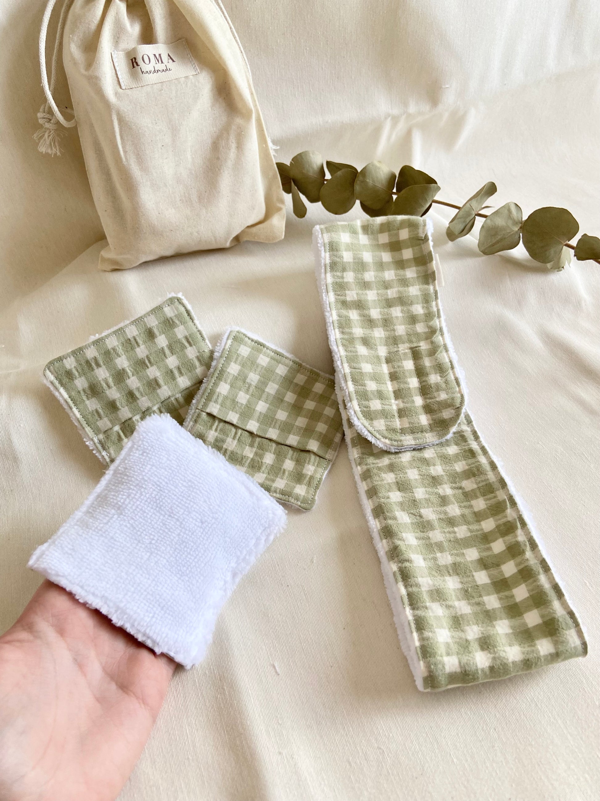 Incluye 3 Toallitas desmaquillantes reutilizables, 1 diadema con cierre de velcro ajustable y 1 bolsita de algodón para guardar y transportar todo.